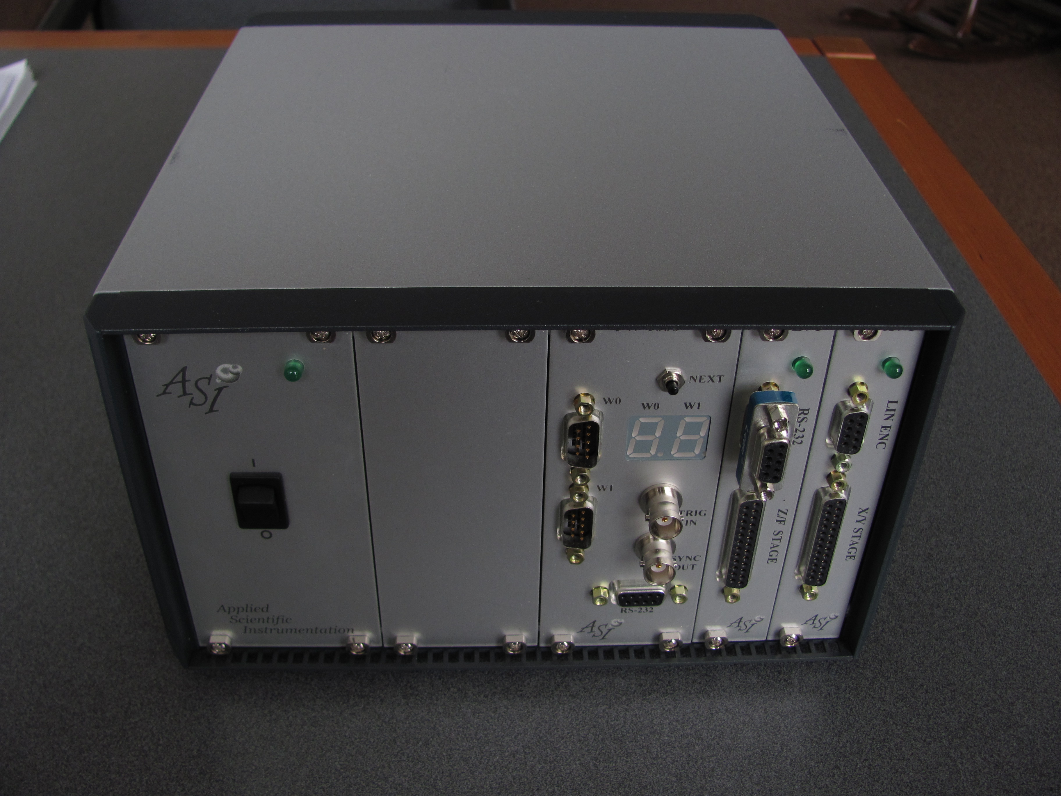 The stages and filter wheel are off the shelf ASI parts. The controller appears to have been custom made for Illumina. While it uses a standard ASI serial command set, each command set requires a prefix. Luckily, Erich Hoover wrote a patch for the Micro-Manager ASI device drivers (stages, filter wheel) to make the LX-4000 work.