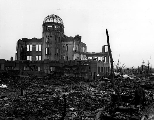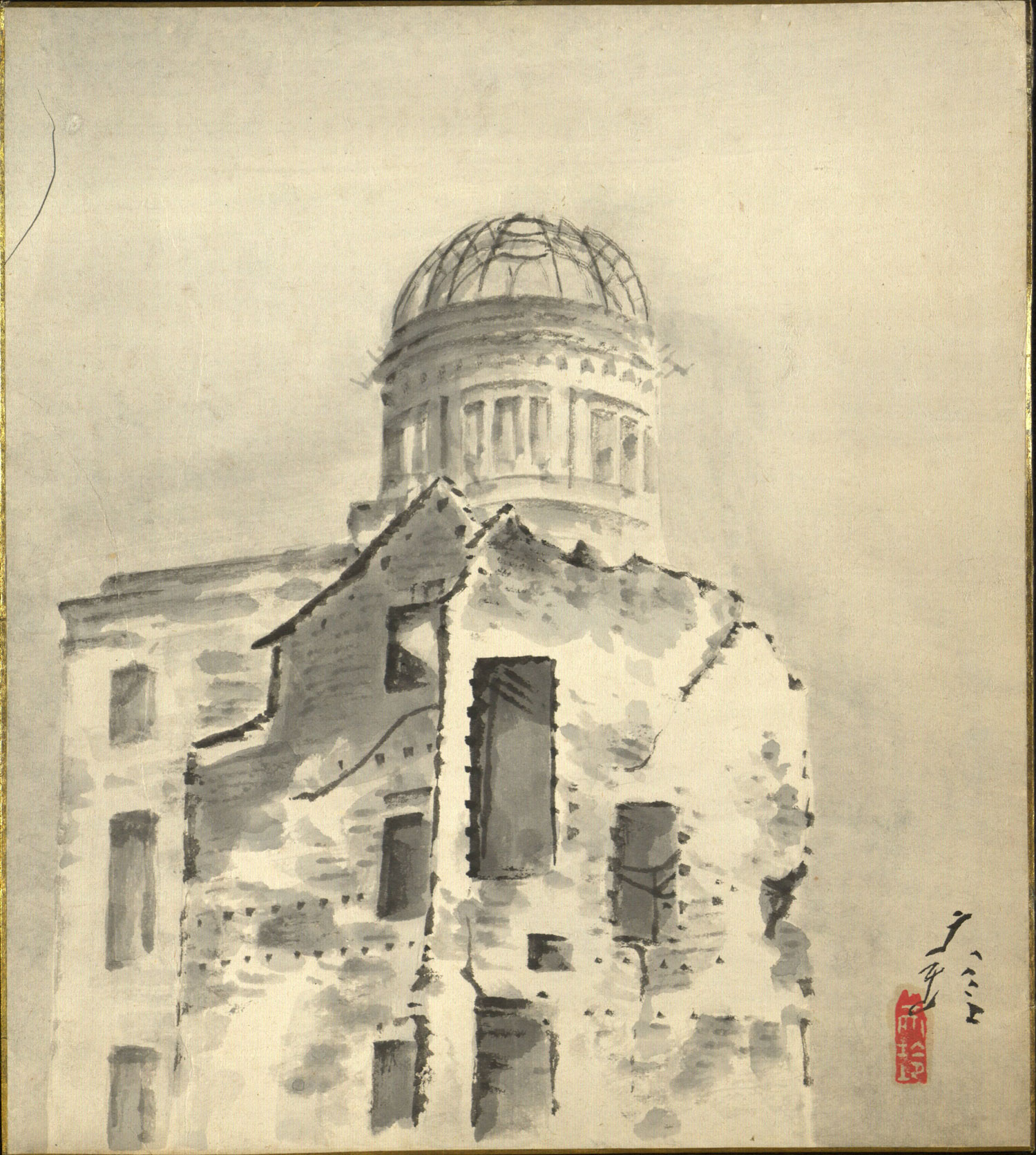 After the bombing of 1945, Hiroshima stood in ruin. All had been destroyed by the explosion. All but one building remained, the A-Bomb Dome. This painting captures what was left of the A-Bomb Dome after the bombing. Jan Letzel, an architect from the Czech Republic, designed this Western styled building built out of brick and cement. Although brick buildings are vulnerable to earthquakes, they hold up against fires. As seen in figure 1, the buildings made out of brick survived the bomb, while all the wooden structures were wiped out. An additional Western feature was the garden to the south of the building. Other unique features the building contained were the curved walls and the copper-plated dome (Slideshow of Atomic Bomb Dome).