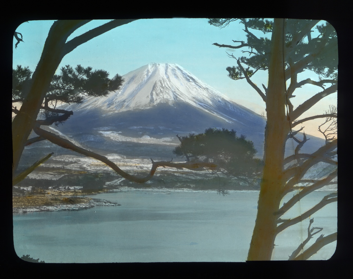This hand-colored slide shows Mt. Fuji artistically framed by pine trees, a view looking across Motosu Lake. Just as Wilson observed the mountain through the porthole across the water, the viewer of this lantern slide experiences a look through the trees across the water. Mt. Fuji is a longstanding cultural symbol, significantly contributing to the sense of national identity. It is central in the role of religious belief and ritual: the climb towards the top is akin to entering paradise in Buddhist belief while Shintoism worships the mountain as a goddess (Clark, 2001). A notable example of art inspired by the mountain is Katsushika Hokusai's famous print series, "Thirty-Six Views of Mount Fuji",an early-nineteenth-century set that captures Mt. Fuji in a variety of compositions.