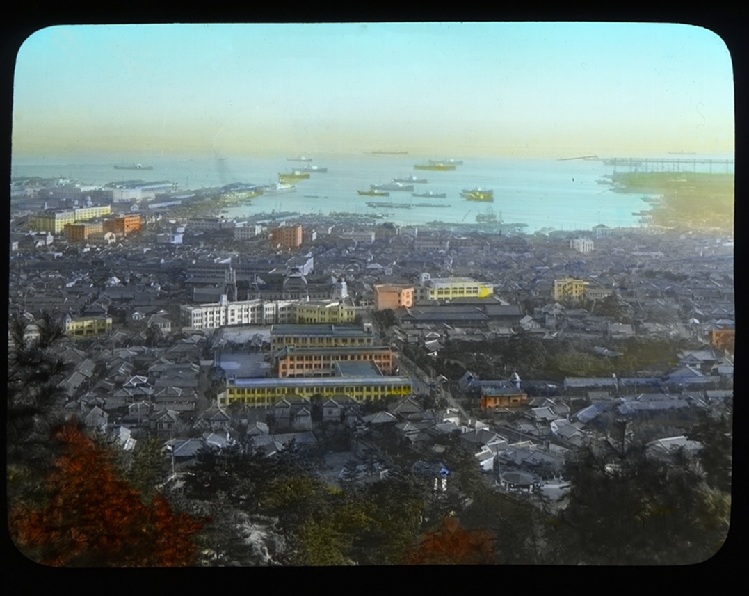 General View of Kobe is a lantern slide by Japanese photographer T. Takagi that features an elevated view of the city looking out towards the harbor. It belongs to the E. Raymond Wilson collection, and though undated, was purchased in either 1926 or 1927 while Wilson toured Japan. The black-and-white slide was hand-tinted with color, most likely by workers rather than Takagi himself. Taken from one of the mountains surrounding the city, the slide features buildings on its bottom edge just visible through the tree tops. Above the trees, a view opens up of the dense city, which extends beyond the side borders of the photograph and consists mostly of small, low home-like buildings and much bigger, taller modern buildings that resemble factories or apartment complexes. These larger buildings are colored in various shades of yellow, orange, and red with blue roofs, while the smaller buildings are left uncolored. Behind the city lays the light blue harbor filled with large ships. To the right are glimpses of uninhabited land extending out, and on the left side reaches out a dock into the harbor. The water extends to the horizon, where it blends in with the sunrise and the sky.