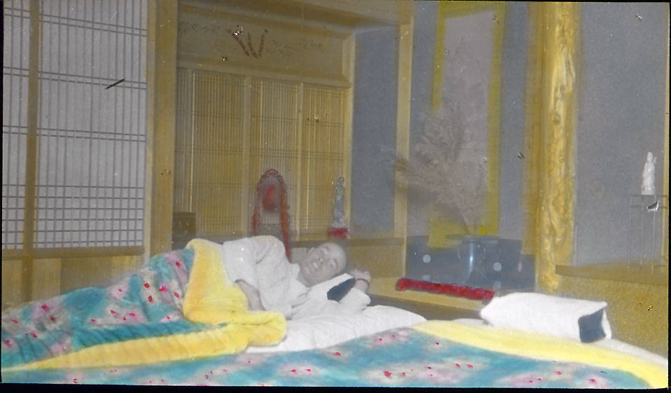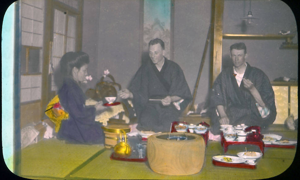 These two lantern slides show E. Raymond Wilson and a friend in the context of a Japanese-style inn (ryokan). They have been hand-colored just like many of the professionally shot slides of landscapes and native people in Wilson's lantern slide collection, but their subject matter is distinctly more candid. In Figure 1, Wilson and his companion are served a meal, donning matching robes (yukata) provided by the inn and eating seated in the Japanese style. In Figure 2, Wilson can be seen relaxing under the covers of a futon, which would have been laid out on the floor after the meal had been cleared away.These two slides are unique within the Wilson collection in that they show Westerners in a Japanese environment.