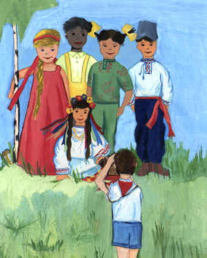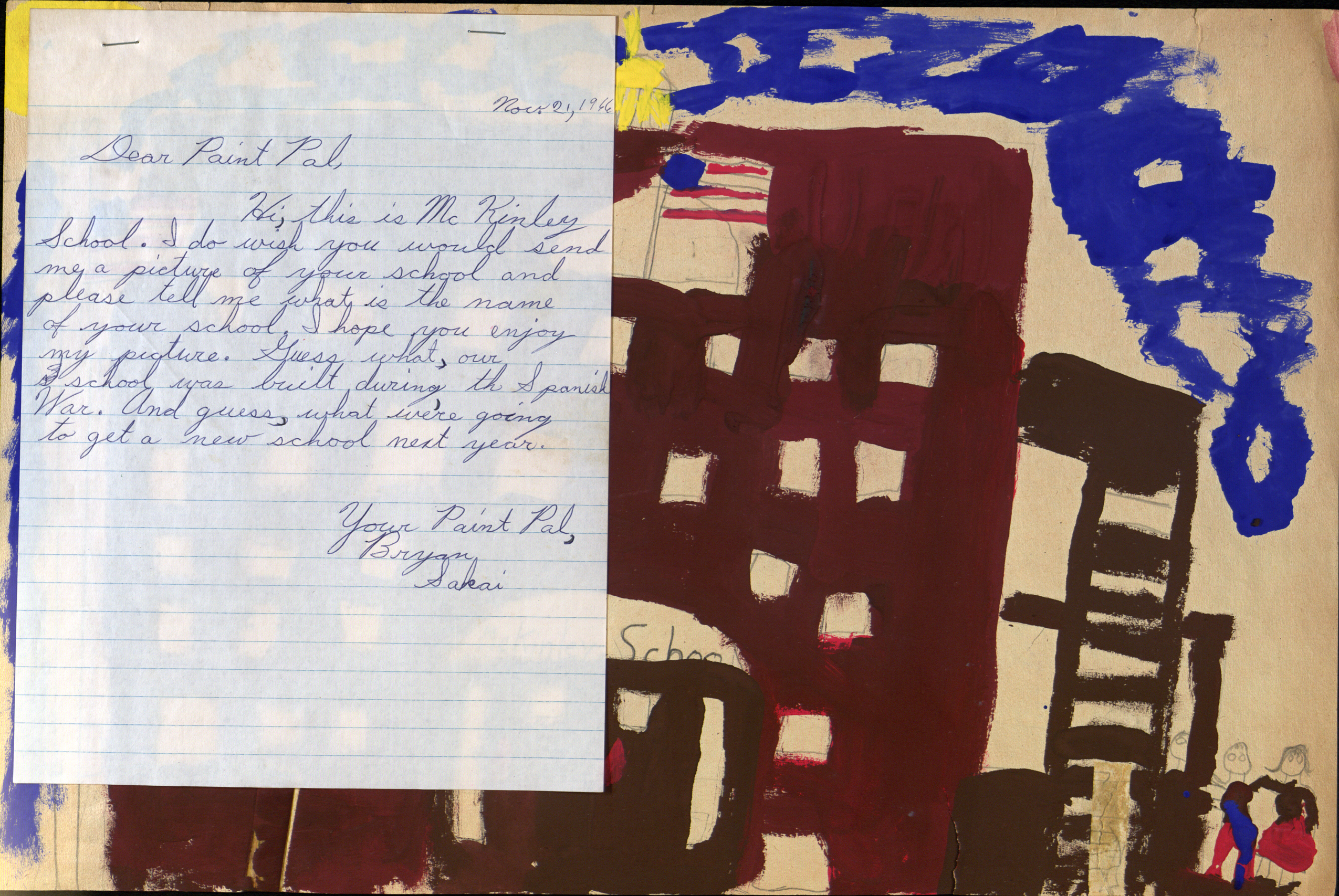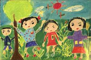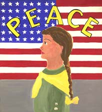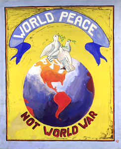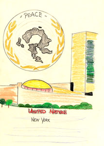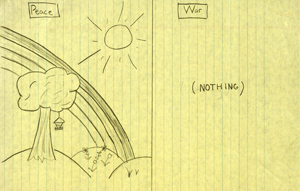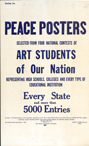 This exhibit celebrates still another aspect of children’s efforts for peace: their artwork. The pieces included, out of over 1500, envision a world in which all people live together in harmony and equality, and where war has been abolished. The drawings and paintings, gathered by Art for World Friendship in 1947-1978, are by schoolchildren who wished to share some aspect of their lives with children in other countries. The posters were created by older students for a contest in for the 4th annual poster contest, 1939, sponsored by the National Circulating Library of Students' Peace Posters, and show what they saw as the best response to threats of