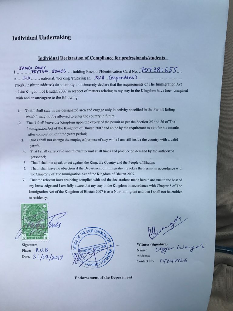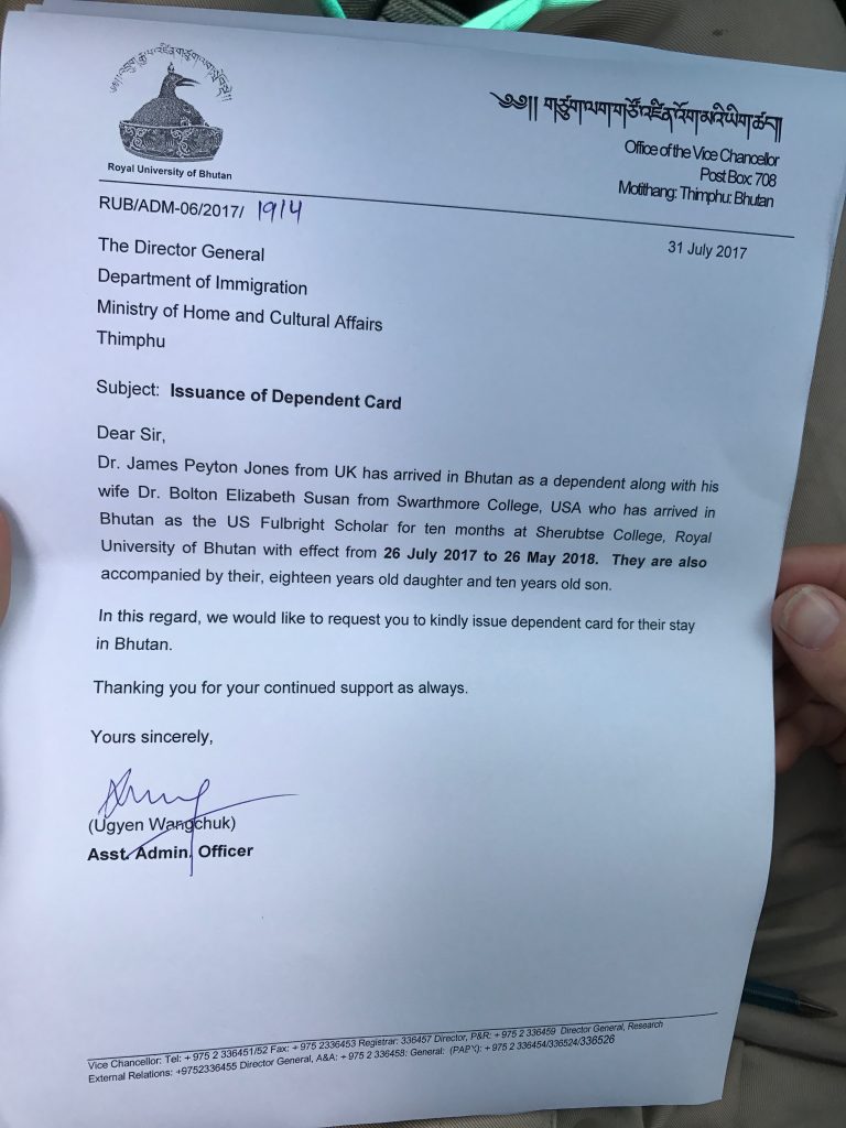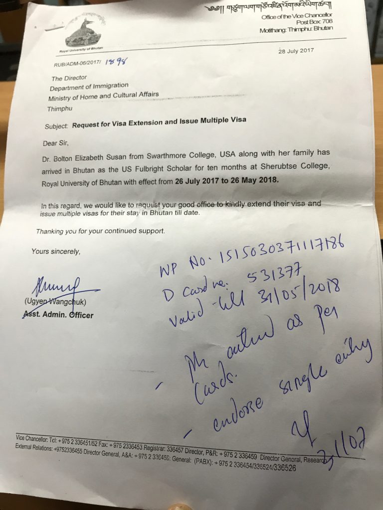 “The visa applications specify multiple entry visas,” the head officer explains. “But that’s quite expensive: 24,000 ngultrum per person.” Given that we can only take out 10,000 ngultrum at a time (and that’s $150, we decide to stick with a single entry permit for the moment. Off we go to a cash machine, then to a different desk to make the payment and get a receipt, then back to the head officer, then out to a different counter for the actual visa stamps.