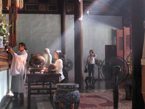 Inside the pagoda is a magnificent temple. The smoke of burning incense catches beams of sunlight as Adrienne Hopkins (in white) kneels before the altar.