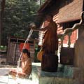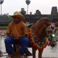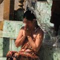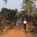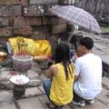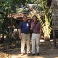 On Tuesday afternoon, Steve Hopkins and I happened on a living Buddhist monastery in the woods near the Royal Palace and witnessed a water blessing—something quite unusual, said Steve. There are several other contemporary Buddhist shrines dotted among the ruins, and we stopped to light a joss stick and say a prayer to Buddha in the Mahayana way, where Buddha lives in and around us. We met some great Cambodian kids that day, who hustled us for dollars while "guiding" us around the monastery. One of them took the picture of Steve and me. I'm wearing a woven straw bracelet sold by another.
